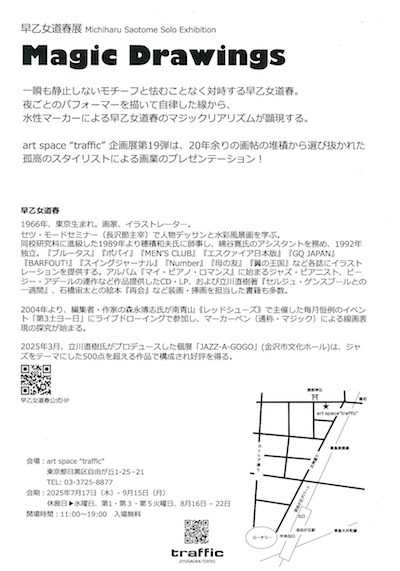TOKYO ART BEATで、2025年7⽉17⽇(⽊)から art space “traffic”(東京・自由が丘)で開催される早⼄⼥道春展覧会「Magic Drawings」が紹介されています。